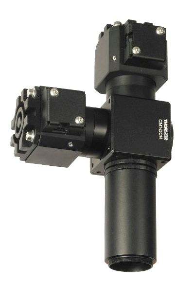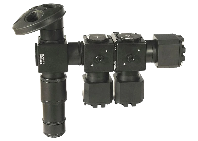 In this figure one can see TLC integrated with microscope setup consisting of Thorlabs components (filter cage and RMS turret) and our IN2-0.5x imaging lens; camera port with c-mount; works in upright and inverted configuration.